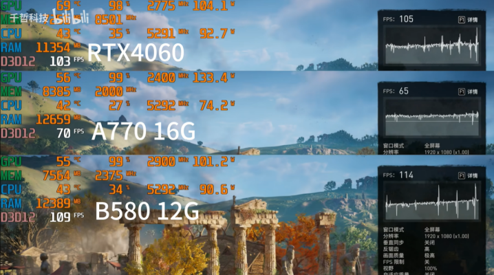 以网游代表CS为例,在1080P预设高画质下,蓝戟Arc B580 Photon的平均帧率为265 FPS,1% Low帧为153,成绩非常接近RTX 4060,即便是运行对CPU和显卡要求颇高的《全面战争三国》,蓝戟 Arc B580 Photon都可以达到136FPS,相比A770以及RTX 4060高13帧。在《刺客信条:英灵殿》3A游戏实测,1080P画质下,蓝戟 Arc B580 Photon同样领先A770和RTX 4060,而在《赛博朋克2077》预设超级档中,更是与RTX 4060拉开36%的差距,优势非常明显。(数据来源:千哲科技)总体来看,蓝戟 Arc B580 Photon确实能跟RTX 4060打得有来有回,而且其还具备生产力方面优势,在同价位段里,绝对算得上是最值得入手的显卡之一。