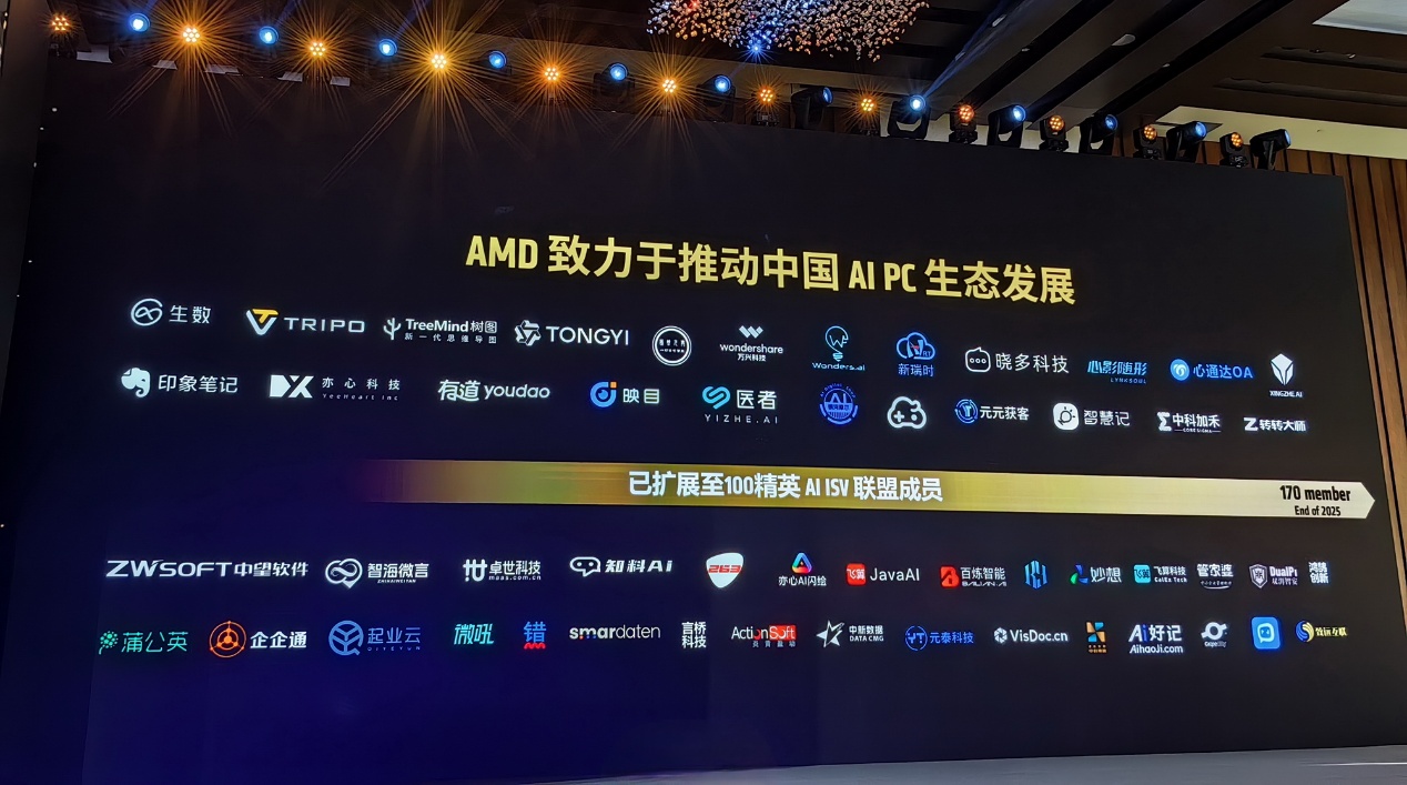 在峰会上,AMD再次强调了与合作伙伴和社区一起推动中国 AI PC 生态系统发展的承诺。自2024年3月启动以来,现在AMD 中国 AI 应用创新联盟的ISV合作伙伴已经超过 100 家,并预计将在2025年底达到170家。