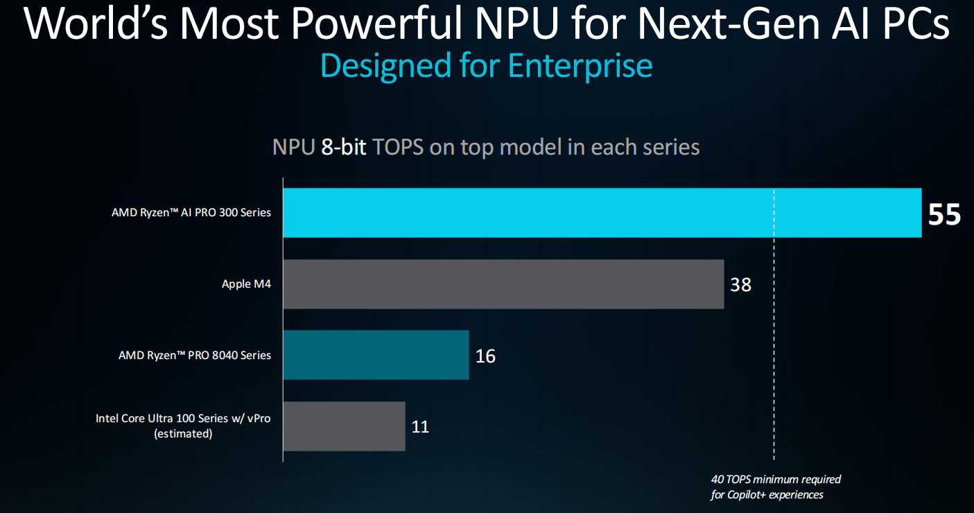 锐龙AI PRO 300系列内置的XDNA 2架构NPU算力最高可达55 TOPS,已经远超竞争对手,而实际上要达到微软Copilot+ PC的标准,NPU的算力至少要达到40 TOPS。严格来讲,目前只有锐龙AI 300/PRO 300系列能够轻松超越这个标准。这也就意味着采用锐龙AI 300/PRO 300系列移动处理器的笔记本,才算是真正能提供出色体验的AI PC。
