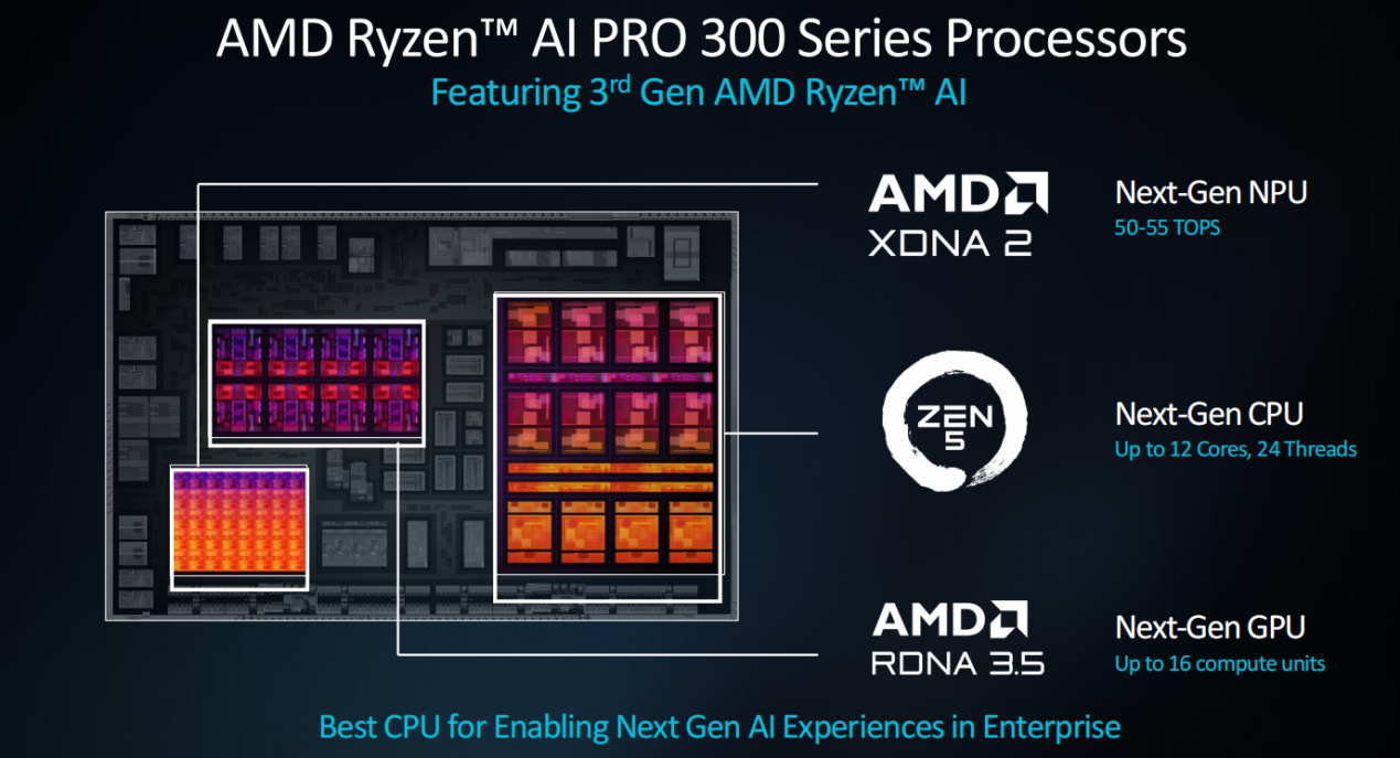 之前我们在首发测评中已经详细介绍过基于4nm工艺、Zen 5架构的锐龙AI 300系列移动处理器,而锐龙AI PRO 300系列则是在其基础上增加了针对商用的AMD PRO技术,进一步提升了安全性和可管理性,明确了商用定位。因此,可以看到锐龙AI PRO 300系列也是由Zen 5架构的CPU、RDNA 3.5架构的GPU和XDNA 2架构的NPU组成,拥有最新的三位一体AI加速能力。