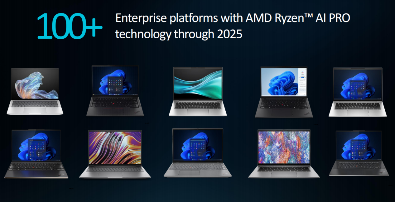 预计到2025年将会有超过100+的企业平台搭载AMD锐龙AI PRO技术,这也意味着锐龙AI PRO平台将会构成更加丰富的生态圈,为企业用户提供更加完善而成熟的商用AI PC移动解决方案。