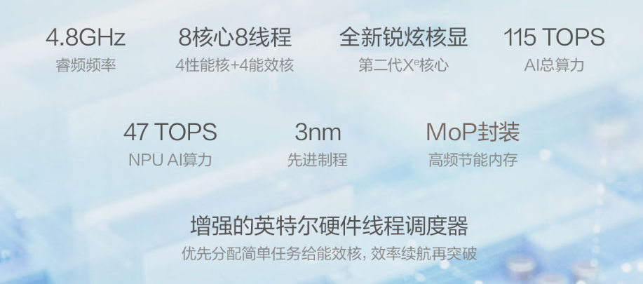 在大家最关心的硬件配置方面,灵耀14 Air搭载的是第二代酷睿Ultra处理器,可选Ultra7 258V和Ultra5 226V两个配置。Ultra7 258V隶属于英特尔新一代Lunar Lake轻薄本处理器系列,采用的是4P+4E的架构,也就是8核8线程的规格。核心工艺为台积电N3B工艺,即3nm制程。需要注意的是,Lunar Lake把内存整合进了处理器封装,其名字结尾的“8”即代表是32GB内存,规格为LPDDR5X 8533MT/s,SSD则是1TB PCIe 4.0规格。