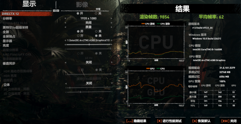 ▲而在实际游戏测试中,在《古墓丽影:暗影》1080P分辨率,预设中等画质,XeSS质量模式下,蓝戟 intel ARC A380 PHOTON的平均帧率为62 FPS,已经足够流畅了。