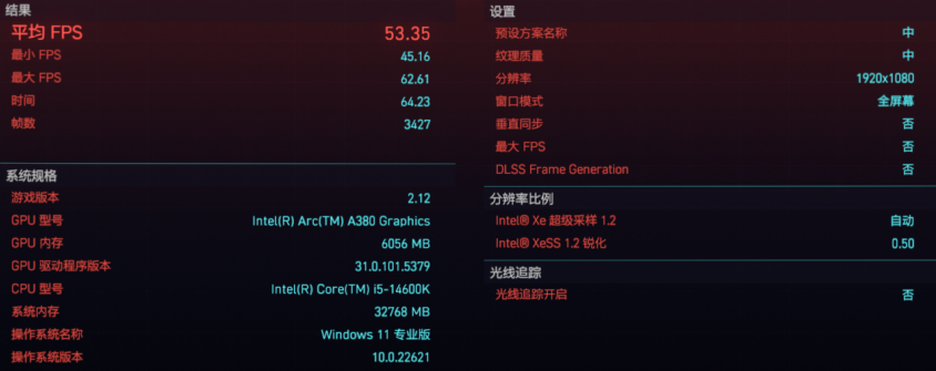 ▲而在《赛博朋克2077》中,1080P,预设中等画质下,蓝戟 intel ARC A380 PHOTON的平均帧率约为53 FPS,也能够比较流畅的游玩游戏。