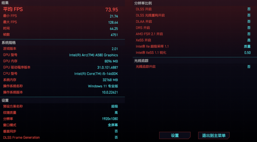 ▲而在号称显卡杀手的《赛博朋克 2077》中,1080P分辨率,预设超级画质下,蓝戟 intel ARC A580 INDEX可以提供74 FPS的游戏帧率,也很流畅。