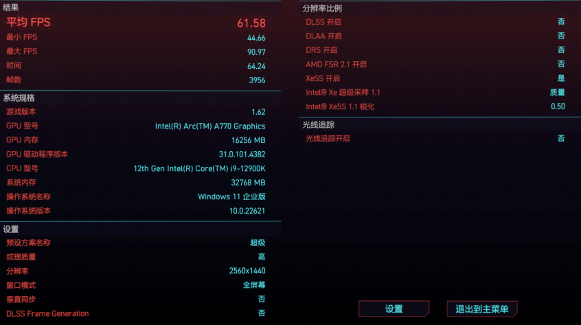 ▲在《赛博朋克 2077》2K分辨率,预设超级画质下,蓝戟 intel ARC A770 PHOTON 16GB OC能够提供约62 FPS的平均帧率。
