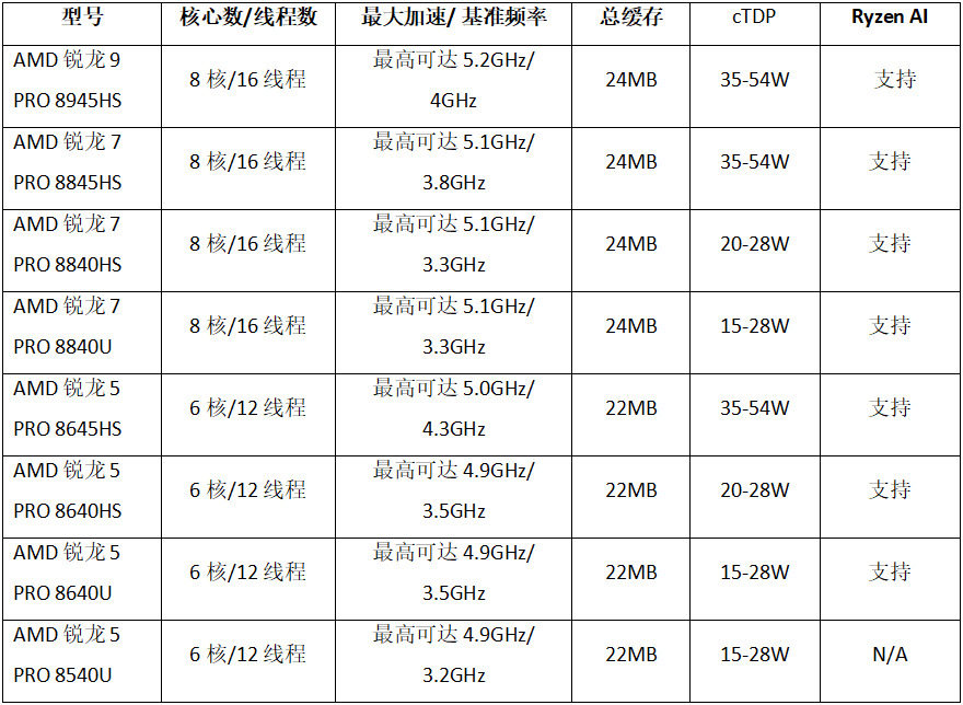 该系列最高规格产品是AMD 锐龙9 PRO 8945HS,配备8核16线程,24MB缓存,搭载Radeon 780M显卡。这些处理器为资源密集型应用程序设计了强大的处理能力,在技术计算、多媒体内容创建和独立显示方面,可以承担对图形要求苛刻的工作负载,如3D渲染、视频编码和照片编辑等。