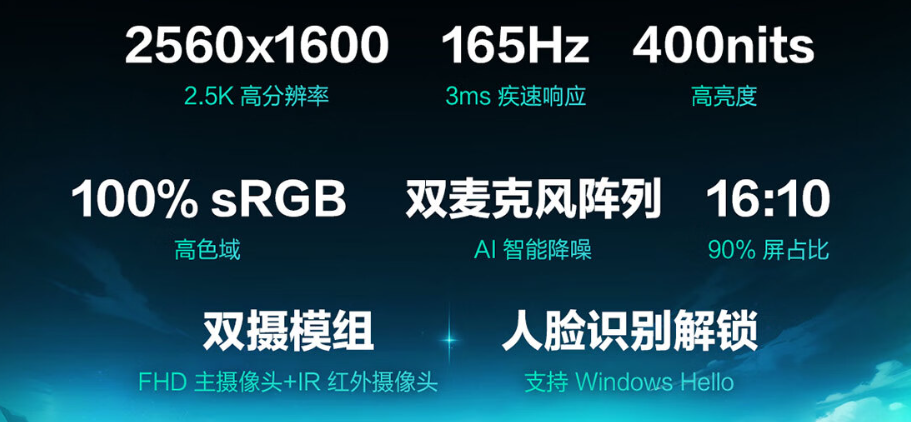人机交互上,天选锐龙AI版搭载了一块16英寸2560×1600分辨率165Hz高素质屏,100%sRGB色域,响应时间3ms,支持NVIDIA G-SYNC技术和双显三模,宣称最高亮度400nits。机身电池容量达到了90Wh,在集显输出模式下具备更长的续航能力,另外支持100W PD充电。