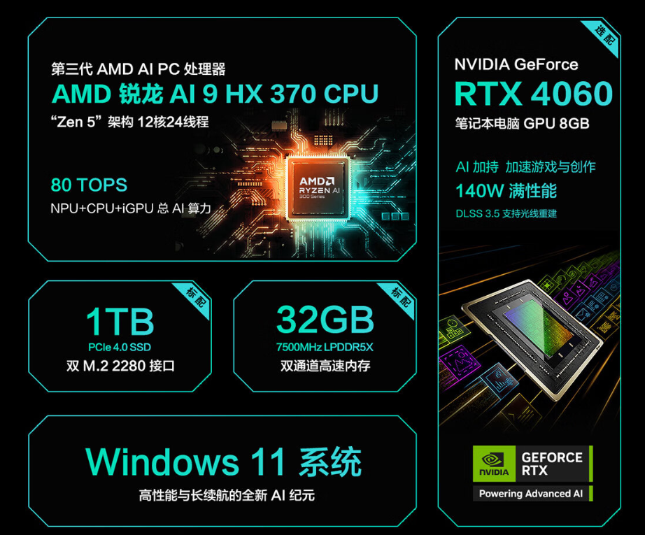 目前天选锐龙AI版已经登陆京东自营平台,锐龙AI 9 HX 370+RTX 4060款首发价格9999元,补贴后7959.21元。锐龙AI 9 HX 370+RTX 4070款首发价格11999元,补贴后9939.01元。