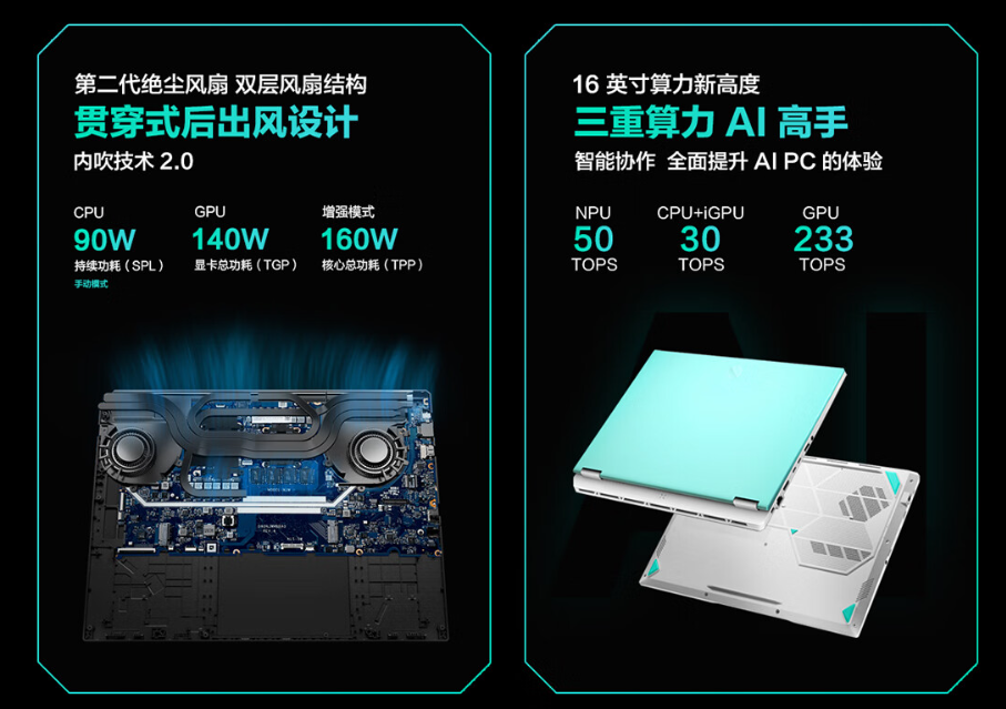 该机的性能释放也不用担心,天选锐龙AI版内置了冰川散热架构升级版,搭载第二代绝尘风扇,带来更强风力,采用纯铜热管覆盖核心硬件,搭配内吹2.0技术和贯穿式后出风,让整机的散热能力更加出色,增强模式下的性能释放可达160W。搭配好用的奥创智控中心,切换性能模式方便易用。