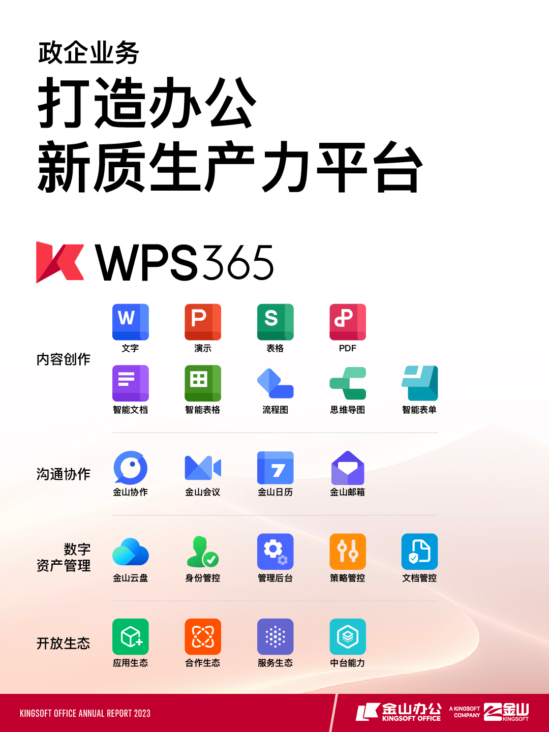 2023年,金山办公面向组织级客户推出办公新质生产力平台——WPS 365,带动国内机构订阅及服务业务收入9.57亿元,同比增长38.36%。
