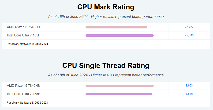 如果把锐龙5 7640HS和锐龙7 7840HS,以及当下的酷睿Ultra 5 125H性能对比下如何呢?结合一些现有的测试数据,对比来看看: