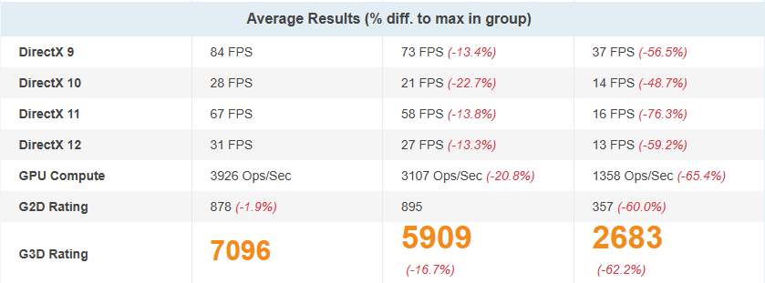 上图为处理器中内置显卡的对比,其中最左侧数据为大家熟悉的地表最强显卡Radeon 780M,G3D评分为7096。Radeon 760M G3D评分为5909,相较低了16.7%。最右侧是酷睿13代处理器中常见的Intel Iris Xe核显,跑分为2683,大幅度落后。