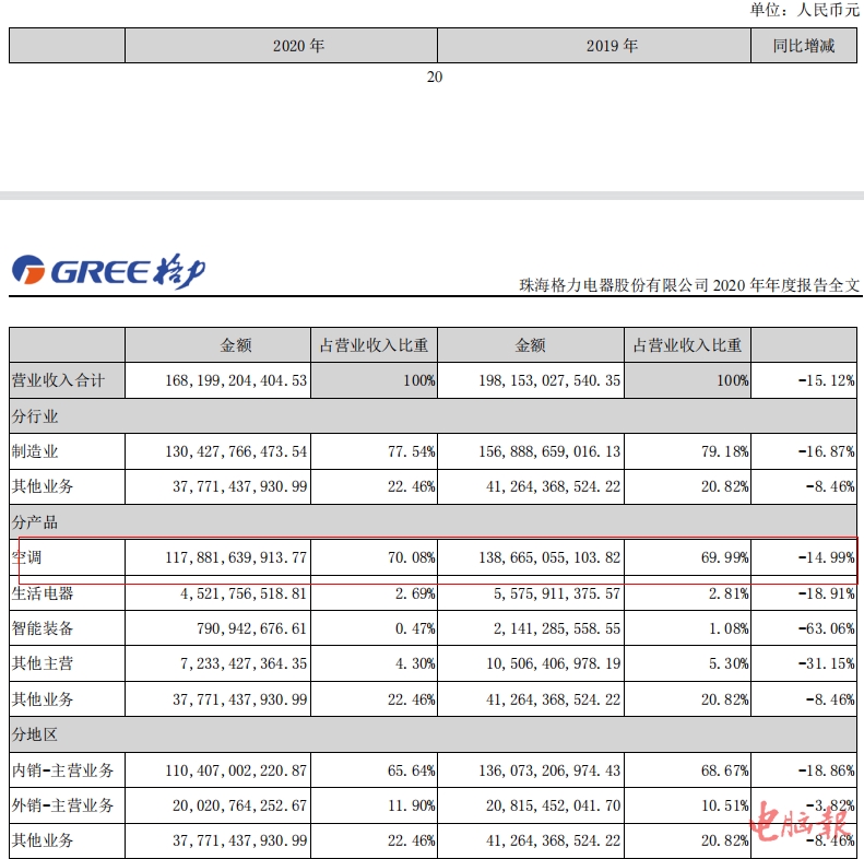 根据公司2020年报,格力电器营收和净利润分别同比下降15.12%和10.21%,为1681.99亿和221.75亿元。尤其在格力最为强势的空调领域,格力营收也比2019年同期下降了47.8%,总收入仅为413亿元。2020年,格力国内总销量为2963万台,市场占有率下滑至36.9%。