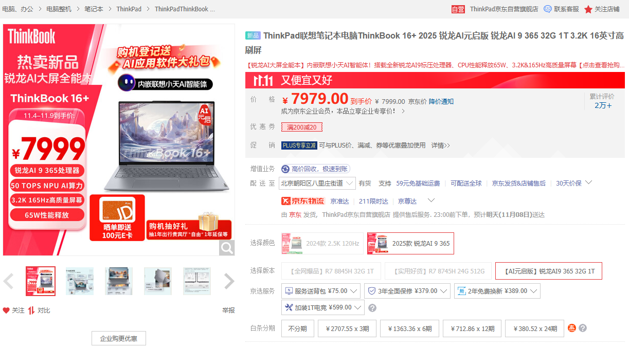 ThinkBook 16+ 2025 AI元启版支持M.2 2280双硬盘位,还具有轻薄本中最多的9类接口,分辨率从3K提升到了3.2K,刷新率高至165Hz。叠加国补后,价格仅有6399元,如果你想体验联想小天智能体的智能终端,优先领略AI PC的魅力,那这台更具办公属性的撞色轻薄本更显实惠。