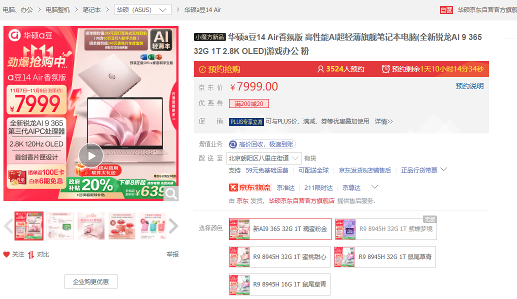 ●推荐理由:华硕a豆14 Air香氛版从各种配色上不难看出是专门面向女性用户设计的轻薄笔记本。它搭载锐龙AI 9 365处理器,处理器核心数量提升约25%,全速模式下能带来50W的性能释放。Radeon 880M集显具有接近40W RTX 3050独立显卡的图形性能,而NPU方面,由于采用了全新的XDNA 2架构,总算力提升约87%,高达73 TOPS。