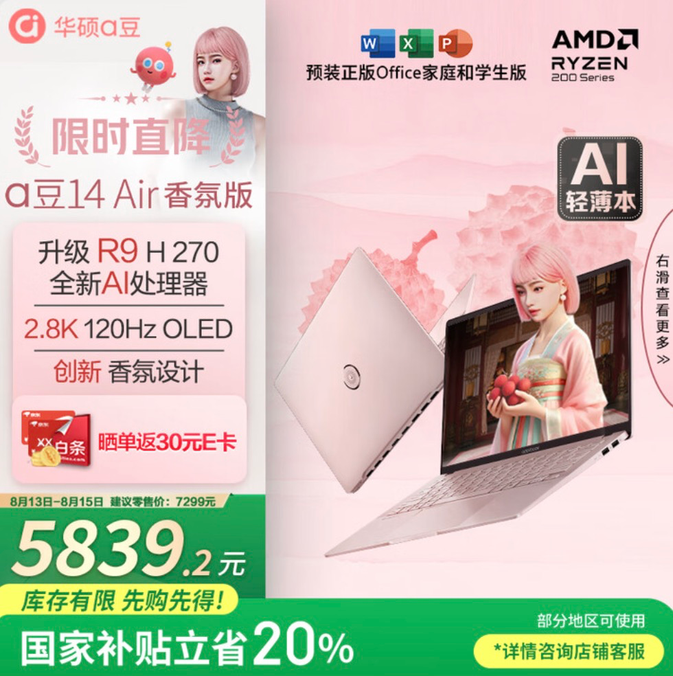 如果要在主流价位选一个最懂年轻用户的时尚笔记本品牌,华硕a豆肯定是不少小伙伴的选择。而在轻薄本市场同质化严重的当下,华硕又推出了全球首款香氛笔记本华硕a豆14 Air 香氛版,不仅搭载了锐龙9 AI处理器、2.8K OLED护眼屏等硬核配置,更以独创香氛设计为学生党、爱美一族、初入职场的女生带来科技与美学的双重享受。目前正值暑促,国补20%后到手价仅5839元起,还可叠加晒单返E卡、白条免息等福利,感兴趣的小伙伴一起来看看吧。