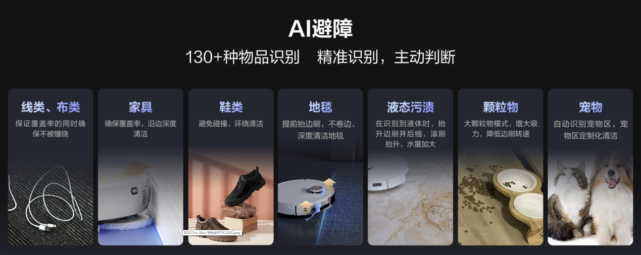 其次是全新的AI智能避障与场景识别功能,RS20 Pro Ultra通过高清摄像头和AI Vision 2.0图像增强技术,搭载了萤石自研的AI大模型,能实时动态识别超130种常见物品和障碍物,例如电线、鞋类、地毯等,实现精准避障。同时,智能托管功能能识别房间类型和地面材质,自动调整清扫参数,使得用户无需手动设置,老人和小孩也能轻松操作。