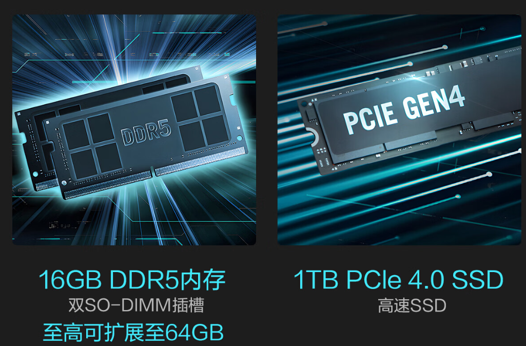 内存与存储则考虑到了未来扩展性:16GB DDR5内存搭配双SO-DIMM 插槽,至高可扩展至64GB,满足重度办公族多软件并行、设计师大文件缓存的需求;1TB PCIe 4.0高速SSD则能实现秒开大型软件、快速加载游戏,避免等待加载的时间浪费。