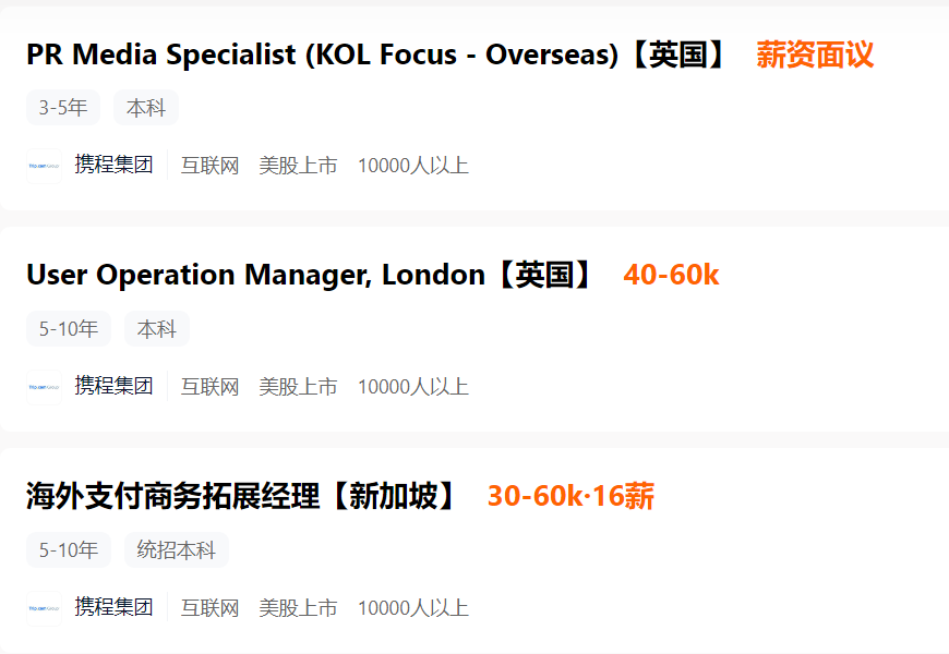 记者同时观察到,与该电商平台招揽国内酒旅人才不同,携程公开招聘的多个岗位所在工作地点标注为伦敦、东京、吉隆坡、曼谷等海外城市,覆盖酒店、度假、向导等多个业务线,薪资水平从20K至60K不等。其集团招聘官网更是打出“我们在23个国家/地区75个城市, 共1,142个职位热招中”的实时slogan。