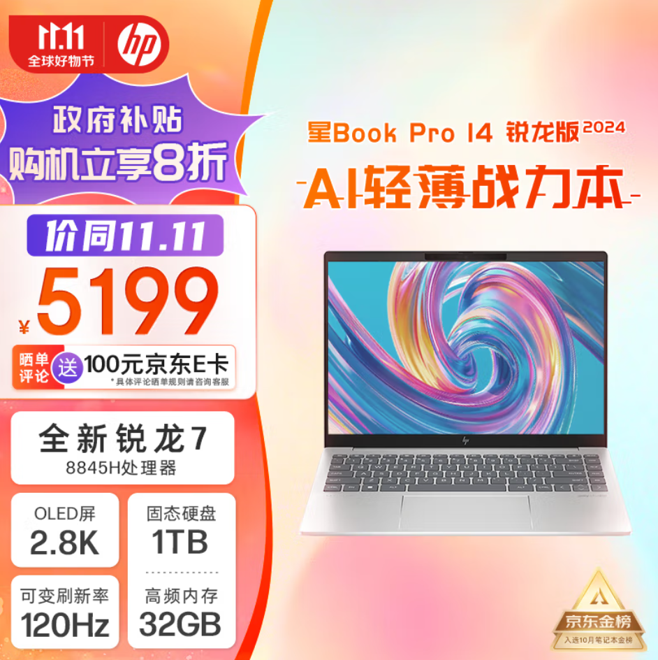 牛叔点评:惠普星Book Pro 14锐龙版同样是国补期间非常热销的一款机型。它采用AMD R7 8845H处理器,至高可实现54W性能释放。惠普星Book Pro 14锐龙版这款机型采用2.8K OLED护眼屏,支持120Hz刷新率,可以手动调到最低48Hz刷新率用来为待机节能。扩展性方面,惠普星Book Pro 14为单SSD接口,因此推荐购机配置为1TB起步。接口方面,拥有双A+双C、HDMI 2.1的配置,双C口均为全功能接口(10Gbps)。值得一提的是,惠普拥有3年7×24小时的E管家,支持远程一对一服务。