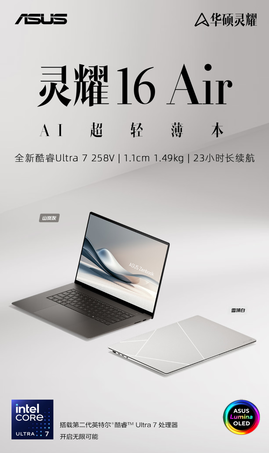 此次上线的新品中,除Arrow Lake架构新品外,华硕灵耀16 Air也迎来全面升级。机身延续灵耀系列一贯的高端品质属性,外观采用高科技陶瓷铝机身材质打造,CNC一体成型,触感温润细腻,极简外观塑造时尚优雅气质。在保持1.1cm纤薄机身、1.49kg超轻重量基础上,配备16英寸2.8K 120Hz OLED华硕好屏,100% P3广色域覆盖、550nits峰值亮度、色准Delta E<1等优势,即使是在户外,也能无负担地进行专业级的大屏创作任务。