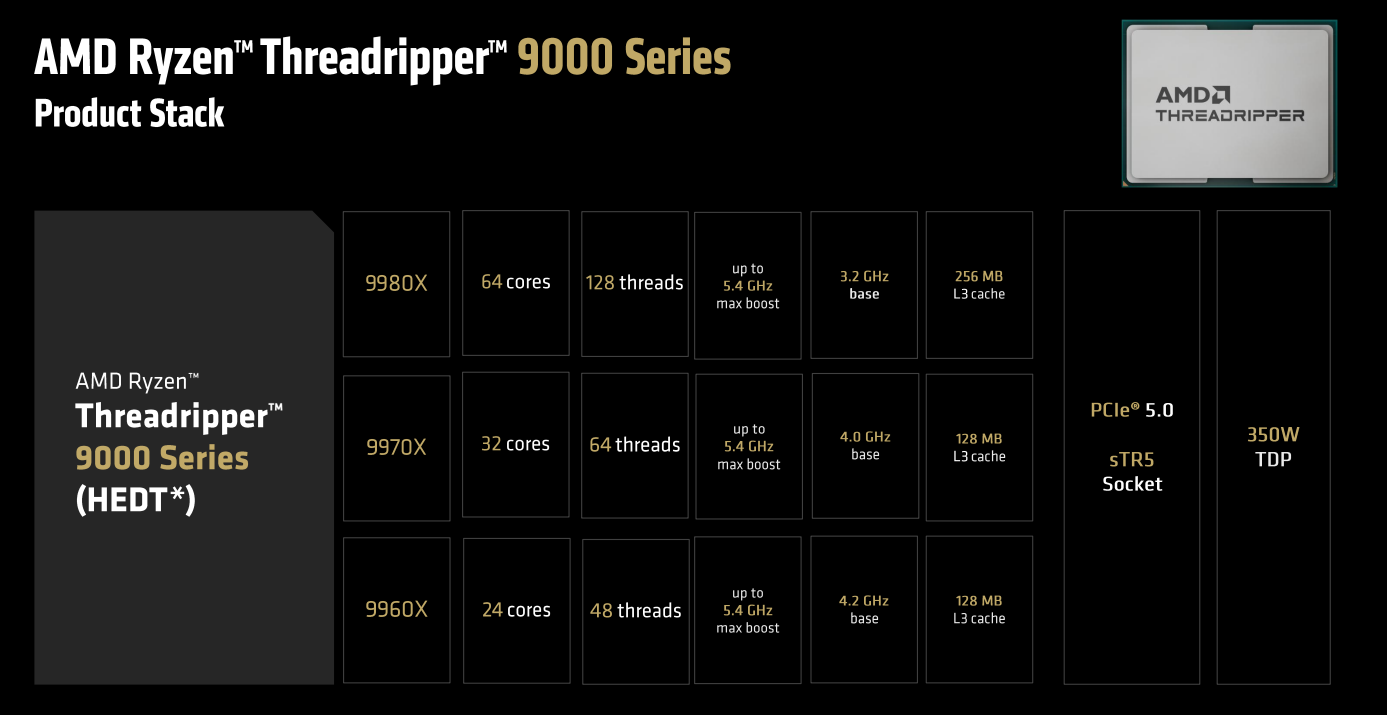 这一系列目前包含3款产品,分别是64核128线程的AMD锐龙Threadripper 9980X、32核64线程的AMD锐龙Threadripper 9970X与24核48线程的AMD锐龙Threadripper 9960X。这3款型号与核心数量相同的AMD锐龙Threadripper Pro 9000WX系列拥有同样的频率、缓存、PCIe版本、TDP设定与主板接口标准,唯一的区别就是没有搭载针对企业用户的AMD PRO安全技术。
