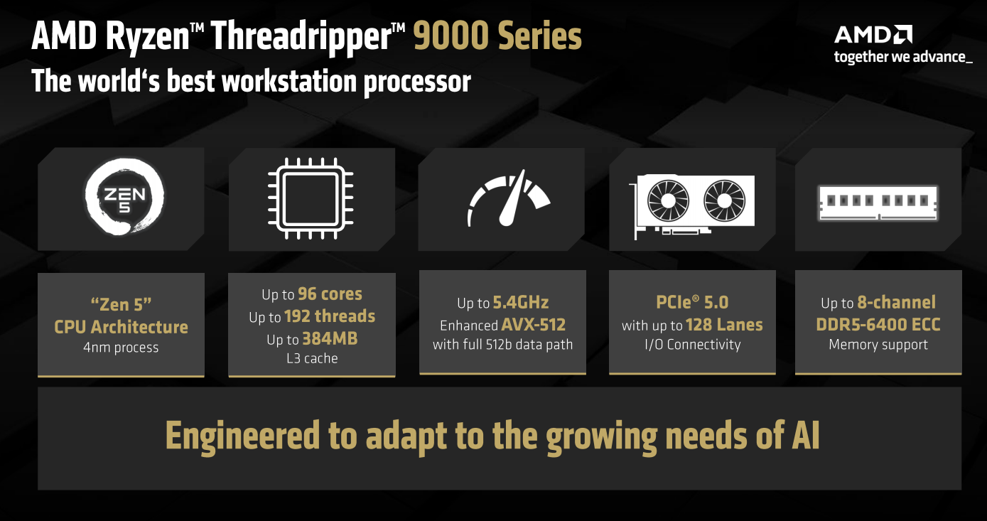 当前虚拟制造、汽车仿真、基础设施修补以及人工智能应用等等这些对于高性能计算的需求自然在不断增加,也正是因为各行各业对计算需求的增加,从而大大推动了工作站的不断进化与升级。因此,锐龙Threadripper终于也升级到了最新的Zen5架构,再次带来了业界遥遥领先的性能、超级的专业平台和世界级的安全与管理功能。