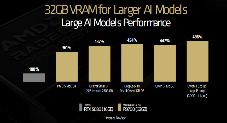如果和竞品的RTX 5080 16GB相比,Radeon AI PRO R9700在运行各种主流大模型时效率的领先幅度从261%到396%不等,可谓是遥遥领先。当然,在这里Radeon AI PRO R9700的32GB大显存起了决定性的作用。