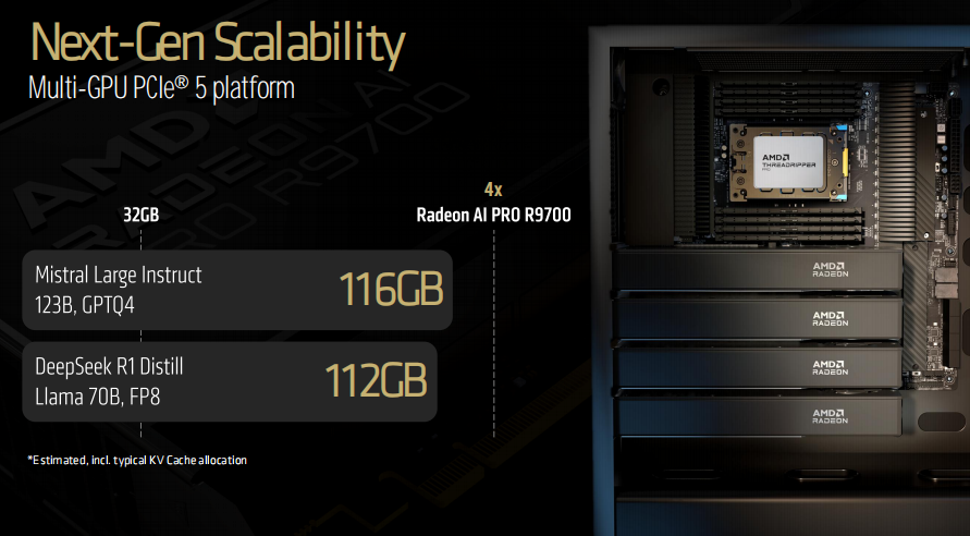 Radeon AI PRO R9700的扩展性也是次世代的,它甚至支持4卡并联,从而轻松支持Mistral Large Instruct 123B(GPT Q4)模型和DeepSeek R1 Distill LIama 70B模型。这两个模型分别需要占用116GB和112GB显存,而Radeon AI PRO R9700做4卡并联拥有高达128GB总显存容量。