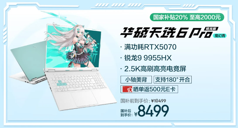 目前天选6 Pro锐龙版将在京东自营平台开启预约,锐龙9 8940HX+RTX 5070多重优惠叠加最终到手价仅为6999元——作为国际一线品牌的热门高配游戏本,性价比无疑非常香!另外,该机还可选锐龙9 9955HX,同样具备16大核32线程超强规格,首发价格10499元,国补到手价8499,也支持晒单返500京东E卡,最终到手价7999元,也很有吸引力!