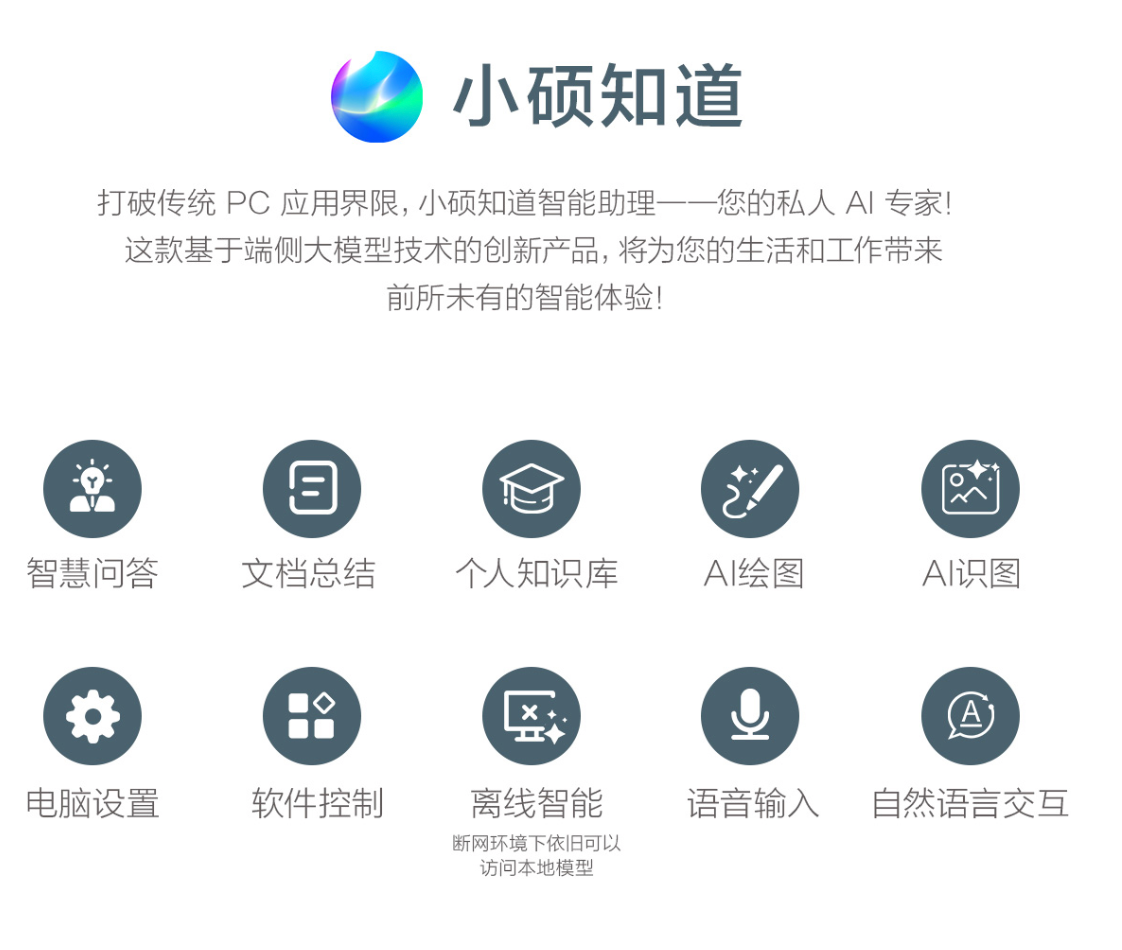 小硕知道能够根据你的需求,快速进行文章提炼总结、问题解答等,将文件资料放入本地模型学习,建立个人知识库,可以让问答效果更加准确高效;它可直接操控屏幕亮度、蓝牙、音量等设置,甚至打开微信、飞书、WPS等第三方软件,轻松完成窗口切换,提升工作效率;支持AI绘图、AI视图,只需简单描述或选择特定风格就能自动生成独一无二的作品,提供无限可能性,让AIGC创作触手可及。