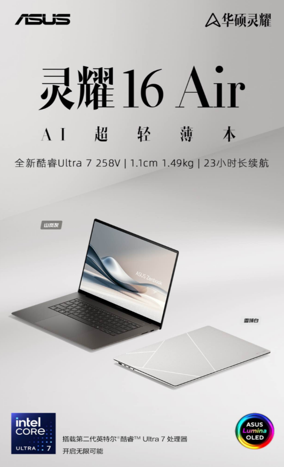 华硕灵耀16 Air AI超轻薄本搭载第二代英特尔酷睿Ultra7 258V处理器同步发布,它拥有CNC一体成型机身,A面采用创新高科技陶瓷铝材质、极简几何线条,探寻科技与美学的共鸣。整机轻约1.49kg、薄至1.1cm,配合超薄散热方案,做到极致轻薄但性能毫不妥协,同时续航时长大幅提升,至高可达23小时,实现全天候在线。