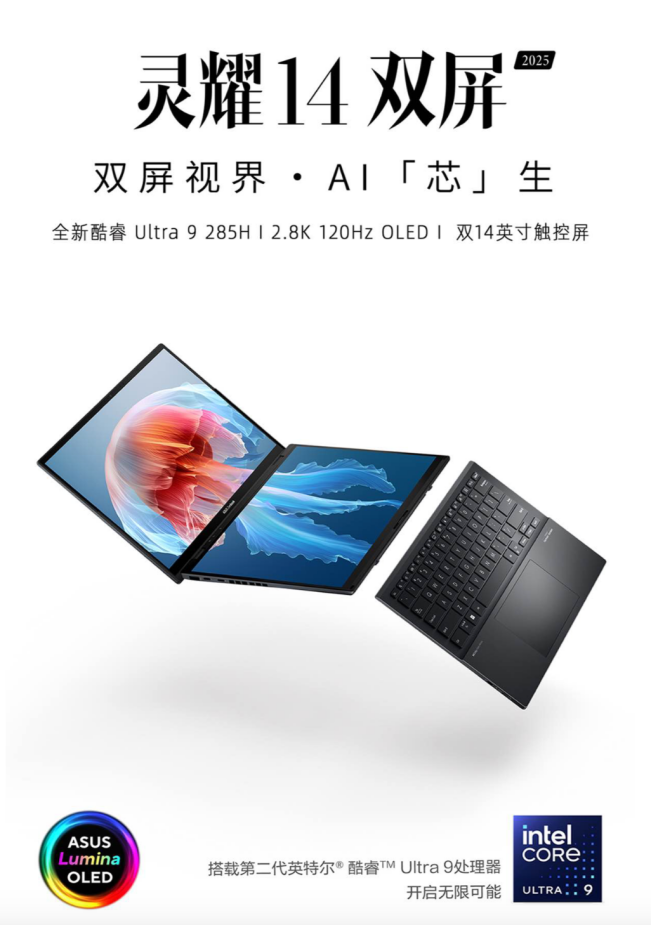 同时发布的还有华硕灵耀14 双屏 2025,搭载第二代英特尔酷睿Ultra 9 285H、双14英寸2.8K 120Hz OLED触控屏,支持笔记本、虚拟键盘、瀑布、竖屏、分享五种灵活操作方式,不仅增加了显示面积,还能实现不同任务分屏显示,减少窗口切换的繁琐,带来更加流畅和沉浸的使用体验,是移动工作者、创作者和多任务处理用户的理想选择。