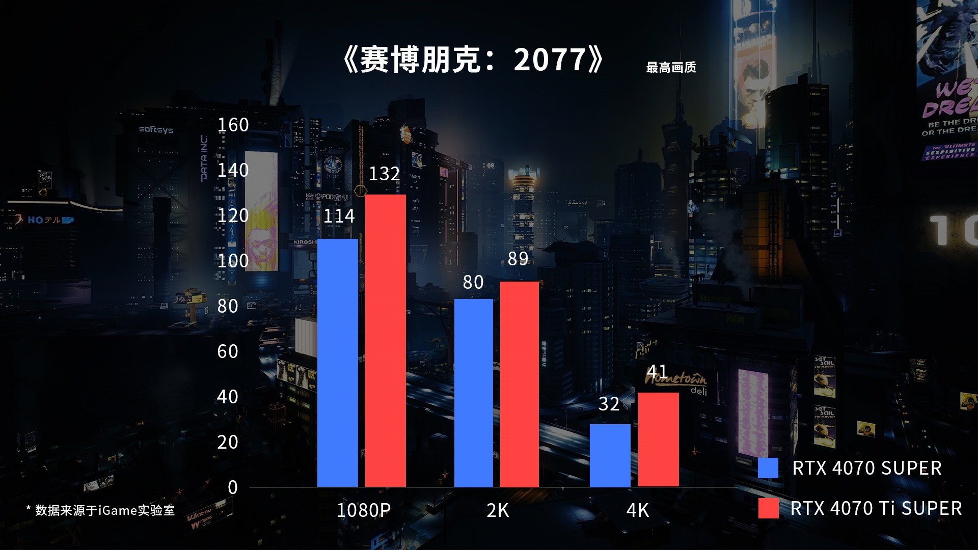 两款高端硬件都能够满足玩家的3A游戏需求,配合NVIDIA DLSS技术能够丝滑流畅的体验目前市面上大部分的游戏大作。我们分别测试了RTX 4070 SUPER以及RTX 4070 Ti SUPER两款产品在《赛博朋克:2077》在测试在1080P、2K、4K的帧率表现(开启光线追踪超速及DLSS质量),其中RTX 4070 SUPER的表现为:114/80/32 FPS;而RTX 4070 Ti SUPER的表现为:132/89/41 FPS,可见即便是面对光追超速的状态下依旧可以保持优秀的帧率。两款产品在DLSS 3/DLSS 3.5技术的加持下均能够流畅应对诸如《心灵杀手 2》、《瑞奇与叮当:时空跳转》、《传送门:序曲》RTX版、《暗黑破坏神IV》《龙之信条2》等游戏,玩家可根据自身的游戏需求进行硬件装备的选择。