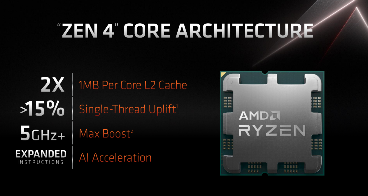 锐龙7000系列台式机处理器采用全新的ZEN4架构,使用5nm制造工艺,搭配的当然是全新的AM5平台主板。从官方宣布的资料来看,这次ZEN4架构大幅提升了二级缓存的容量,每个核心具备1MB的二级缓存,相对ZEN3增加了一倍。单核性能部分,官方给出的数据是提升幅度超过了15%,看起来这与ZEN2到ZEN3的提升幅度相当,不过要注意的是“超过15%”,这意味着是“至少提升15%”,在实际应用中提升幅度还会更大。频率部分,由于架构和工艺的双重升级,ZEN4终于可以实现超过5GHz的加速频率(现场演示的《幽灵线:东京》DEMO中,16核锐龙7000加速频率达到了5.5GHz以上),虽然部分采用ZEN3架构的锐龙5000也可以做到,但仅限于体质较好的个体以及手动超频实现,ZEN4这可是出厂的标准规格,进步也是显而易见的。最后,新特性部分,ZEN4还加入了支持AI加速的扩展指令集,在AI应用越来越广泛的趋势下,ZEN4当然也少不了这项功能。