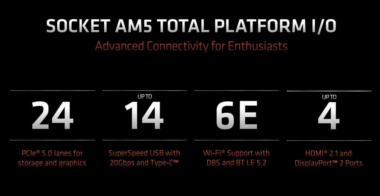 来看看AM5平台的具体I/O规格。从官方资料来看,这应该是包括了处理器与主板芯片整个平台的I/O,包含了24条PCIe 5.0通道,虽说没有具体介绍如何分配,但我们猜测应该是16条给显卡、4条给SSD、4条供处理器与主板芯片通信,当然这还得以官方之后公布的细节为准。USB方面,最多可支持14个20Gbps带宽的Type-C接口;无线网络部分,这次官方加入了对Wi-Fi 6E的支持(DBS与蓝牙LE 5.2)。特别值得一提的是,AM5平台还最多支持4个HDMI 2.1或DP 2.0视频输出接口,这可是DP 2.0接口的首秀,看来AMD又走在了业界最前面。