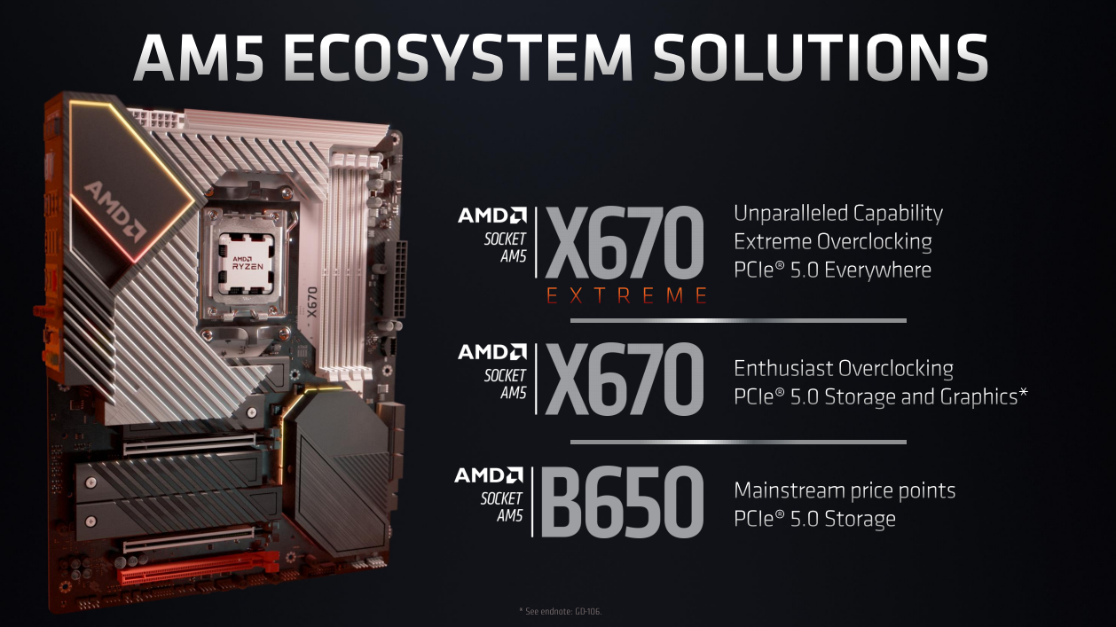 对应的600系主板部分,接口采用了之前已经曝光的AM5插座(CPU八爪鱼造型顶盖尤其抢眼),也就是LGA1718(具备1718个针脚,比隔壁家的LGA1700多18个针脚),AMD这次终于在消费级平台上把针脚做到主板上去了,散热器拔U流玩家可以放心啦。从官方资料来看,LGA1718接口可以独立提供最高170W供电,当然,现在哪还有不加外接供电的主板呢,加了之后自然会高于这个规格。主板支持DDR5内存和PCIe 5.0标准,看来DDR4可以说拜拜了,到了秋季发售的时候,DDR5内存价格也差不多趋于合理了,玩家升级应该阻力不大。PCIe 5.0这里当然包括了显卡与存储设备,等发售的时候,配套的PCIe 5.0存储设备也差不多该到位了。