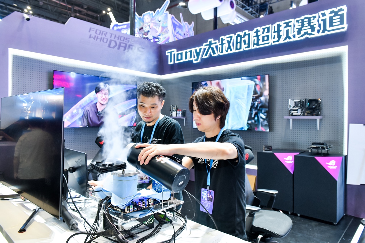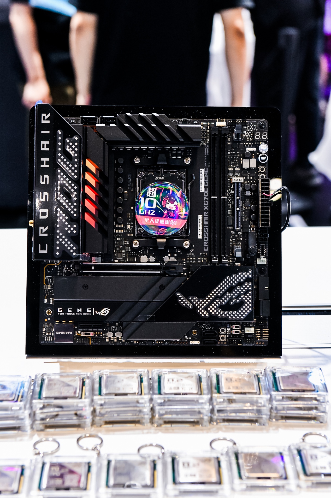 7月12日上午10点至12点,@餅哥Bing联合世界顶尖超频发烧友@Safedisk,又基于ROG MAXIMUS Z790 APEX ENCORE主板,在现场创造出超频新纪录。7月13日下午14点至16点,@普普通通Tony大叔和@极客湾Geekerwan-飘哥空降此展区,辅助现场玩家们进行液氮超频挑战,前来集邮、参与挑战的玩家接踵而至,超频排行榜单也是一再刷新,场面十分热闹。