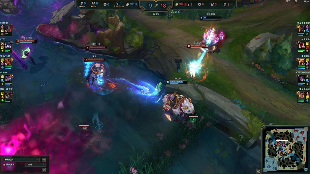 在另一场WHUG对阵KPL的比赛中,KPL在上路拿出的是目前重新强势的鳄鱼,而WHUG的应对则是现版本出场率较低的武器大师,中单KPL则拿出阿卡丽对阵WHUG的阿狸。这两个位置可以说是决定了本场的胜负。尽管阿卡丽开局对线被前期阿狸压制,但在4分10秒左右,WHUG的蔚吃完本方蓝后走河道支援过程中,被同样游走的鳄鱼、机器人抓住,中路的阿卡丽立即摆脱纠缠直接支援,干净击杀WHUG打野首开记录,虽然一分钟后WHUG就在下路3V1击杀辅助机器人,但在5分50秒左右开始的第一条水龙的团战中,WHUG被KPL打出一个3换0的劣势,开始丧失主动权, WHUG顽强抵抗到20分钟左右,随着上路二塔团战失利,人头比被拉到6比12且各路兵线和资源都告急,进入了无力回天的节奏。