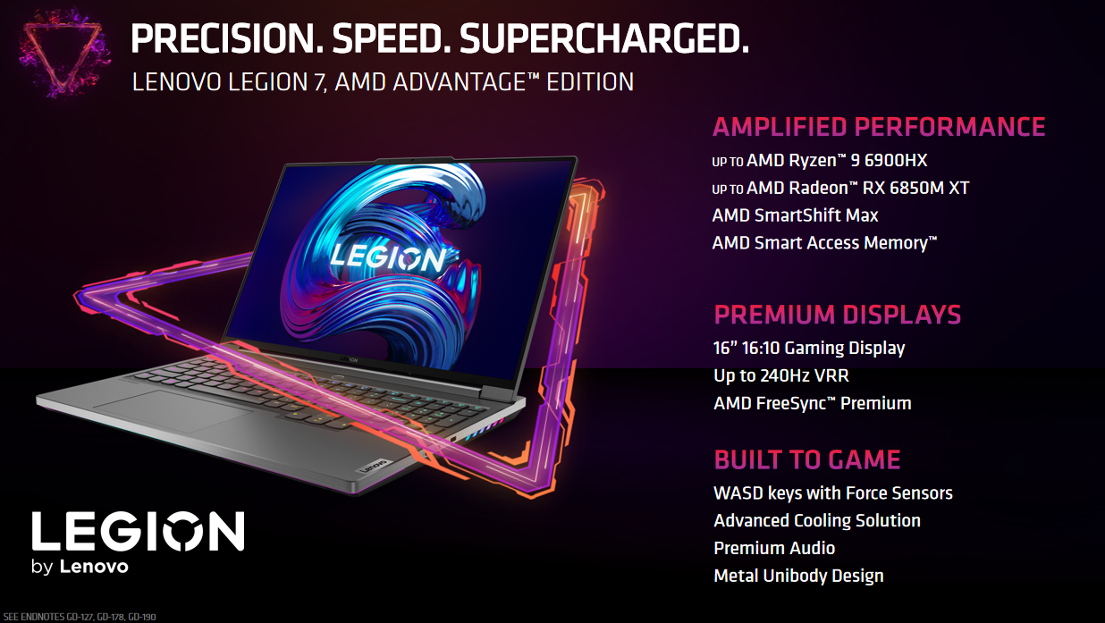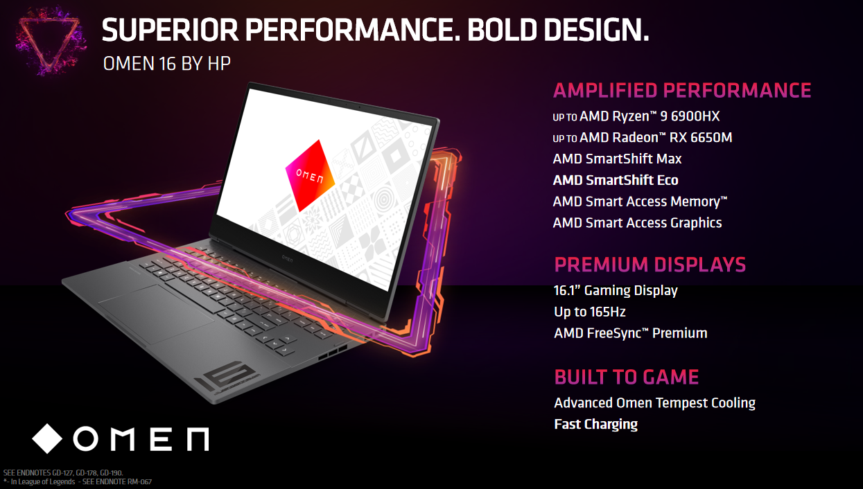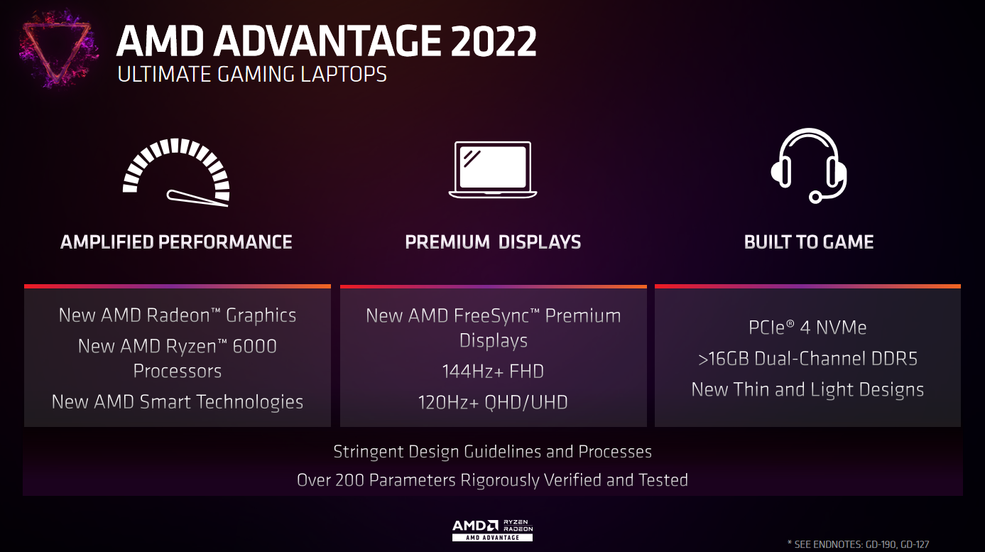 关于AMD超威卓越平台游戏本,有3个重要点。首先,所有AMD超威卓越平台游戏本都配备了AMD Radeon显卡,还有AMD锐龙处理器,以及AMD的一系列创新智能技术;其次,还具备高端显示屏,包括FreeSync技术,144Hz/FHD规格,或者是120Hz/QHD和UHD。最后,它们是专为游戏而打造的,所以周边配备也突出高性能,比如PCle 4.0、NVMe硬盘、16GB双通道DDR5内存,以及最新的轻薄设计。