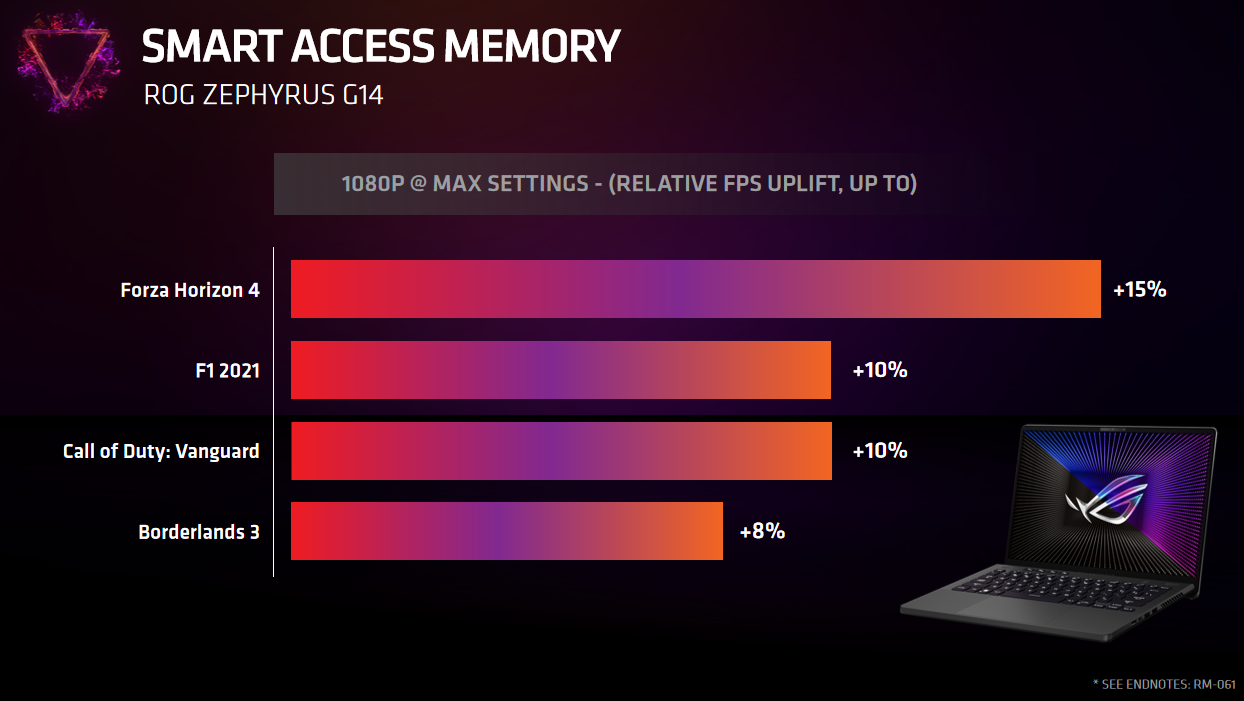 前面介绍过AMD Smart Access Memory技术,那么它的实战效果如何?可以看到开启它之后,幻14能够在1080P最高设置下,获得最高15%的帧率提升。注意这样的技术只有在同时拥有锐龙处理器和Radeon显卡的系统里才能实现,所以是AMD特有的。