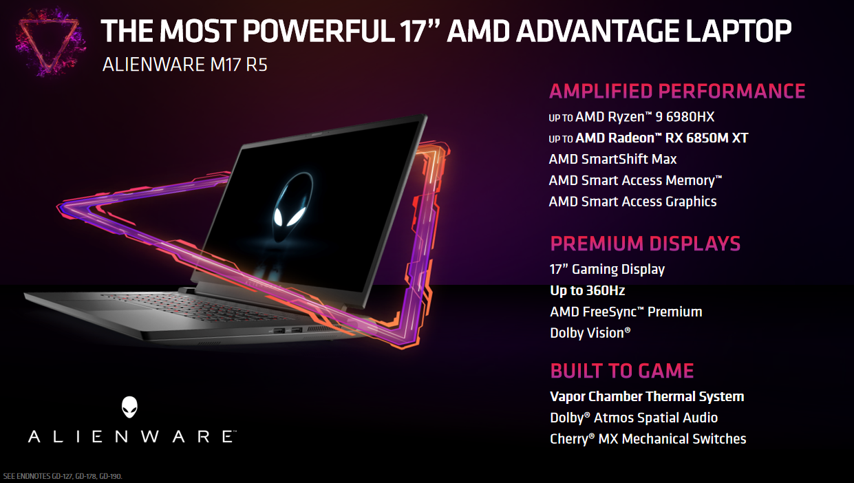除了ROG幻14,还有一些非常强大的AMD超威卓越平台游戏本产品。例如外星人M17 R5,它配备了锐龙9处理器和最强的Radeon RX 6850M XT显卡,还有17英寸360Hz/AMD FreeSync Premium屏幕,以及杜比Vision、杜比Atmos Spatial Audio空间音频,在散热方面也采用真空腔均热板,键盘方面则有Cherry机械切换功能,整体配置相当豪华,提供出色的游戏体验。
