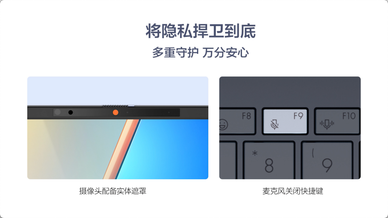 屏幕上方配备1080P+IR AI双摄像头,支持Windows Hello人脸识别解锁,实现开盖即解锁。拥有3DNR视频降噪技术,能够带来细腻纯净的画面效果,通过AI技术实现背景虚化、目光矫正、运动追踪等,让你在视频通话中时刻保持最佳状态。摄像头有着实体遮罩,键盘上设有麦克风关闭快捷键,提供双重保护,充分保障隐私安全。