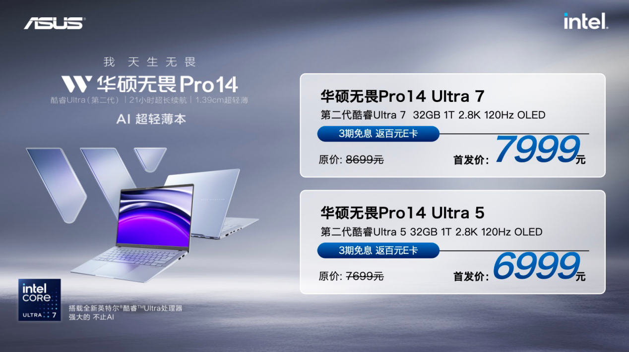 华硕无畏Pro14 Ultra7版本售价8699元,首发价7999元,Ultra5版本售价7699元,首发价6999元。即日起至12月31日,购买华硕轻薄本还可参与以旧换新活动,政府补贴福利满满,北京天津广东浙江等地区用户最高可享20%补贴加持,至高优惠2000元。