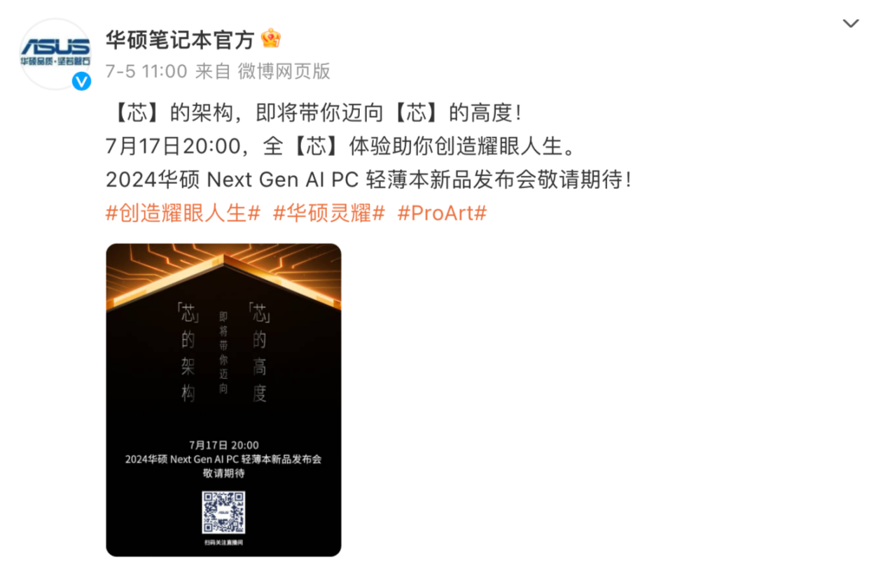 更多新机表现、工艺设计、首发价格等精彩内容,敬请期待7月17日20:00举行的2024华硕 Next Gen AI PC 轻薄本新品发布会。