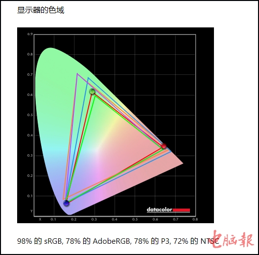 屏幕为13.3英寸FHD高色域屏。实测来看,其色域覆盖为98%sRGB,色准△E平均值为1.11,色彩方面素质出色,用作一般的平面图片后期调色没有问题。屏幕的亮度尤其值得一提,100%亮度时达到了423尼特,在80%时为300尼特,亮度很高,再加上采用防眩光设计,在室外亮光环境也能清晰显示内容。