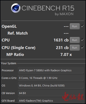 ▲Cinebench R15,惠普ProBook 635搭载的锐龙7 5800U多核得分是1631cb,单核231cb。这个多核得分对于轻薄本而言非常高,25W的四核U处理器多核也就900cb左右,22W的锐龙7 PRO 4750U则是1453cb。另外,从测试中牛叔观察到,惠普ProBook 635的处理器爆发性能是25W,并能持续2分钟左右。
