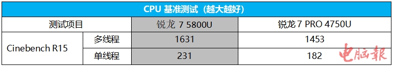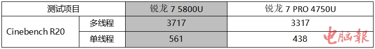 ▲Cinebench R20测试,锐龙7 5800U的多核得分是3717pts,单核为561pts。这个分数较大幅度超出锐龙7 PRO 4750U的3317pts,同时略超上一代60W款8核标压i7 10870H处理器,它的多核分数是3587pts。
