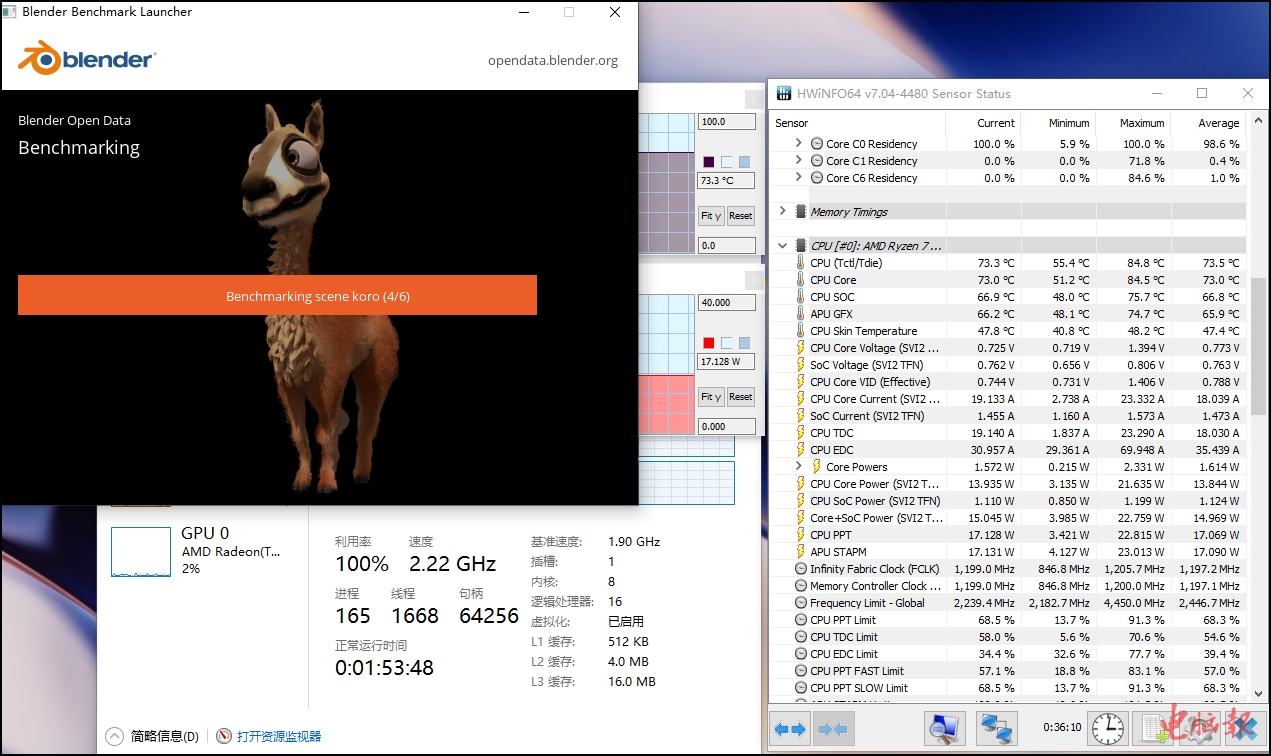 而从测试过程来看,如下图所示,测试渲染测试已经进行了30分钟以上,此时处理器的功率为17W/2.2GHz/73.3℃。